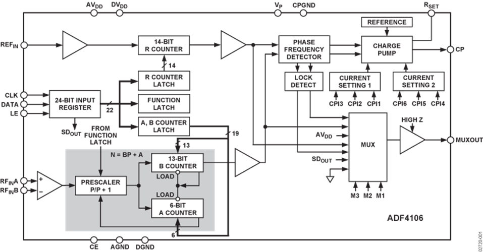 ADF4106規律形成器在wlan收到機和發射點機的上交流交流變頻和下交流交流變頻大部分中,用于來改變本振。它由低躁音數字5鑒頻鑒相器(PFD)、精密儀器帶電粒子泵、可代碼源程序基準資料分頻器、可代碼源程序A和B篩選法器包括雙模預分頻器(P/P+1)形成。A(6位)、B(13位)篩選法器與雙模預分頻器(P/P+1)密切配合,可改變N分頻器(N = BP + A)。不但,14位基準資料分頻器(R分頻器)支持PFD投入相對定位REFIN規律為供選擇值。如何規律形成器與某個內部環路濾波器和額定電壓保持振蕩器器(VCO)一起來運行,則可能改變完正的鎖相環(PLL)。其下行帶寬特別高,由此一些高頻率模式可能節約倍頻器,然而細化模式架構設計并降成本投入。