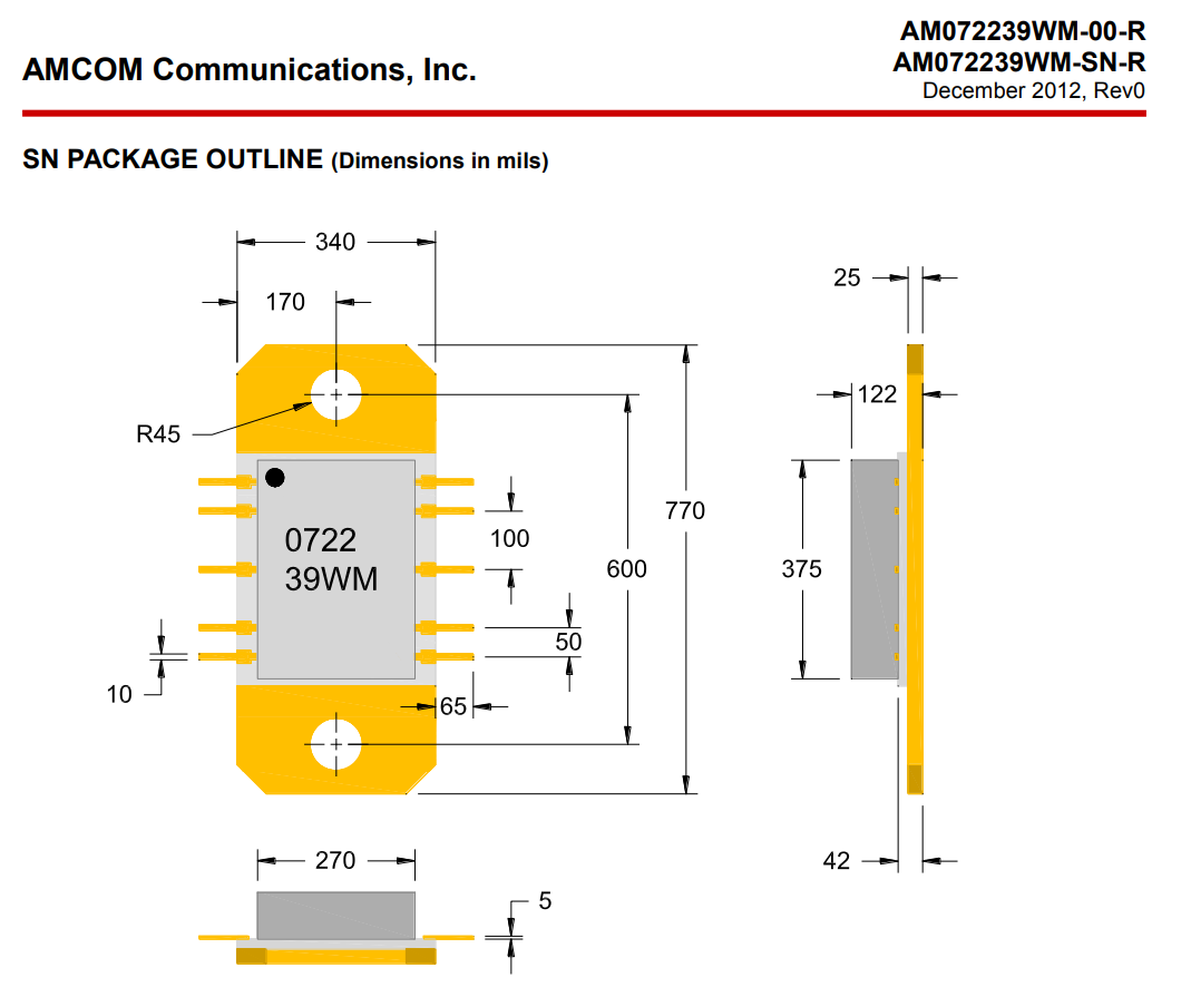 AMCOM的AM072239WM-SN-R是(shi)聯通寬帶GaAs MMIC電(dian)率放縮器。它(ta)有(you)顆個30dB小4g信(xin)號(hao)增(zeng)益(yi)值和39 dBm(8W)飽合工作輸(shu)出的功率CW效能熱效率超出0.7至2.2GHz頻段。MMIC在2個單片機芯片(-00—R)中(zhong)(zhong)能提供。包(bao)(-SN-R)表單控件(jian)。AM072249WM SN-R是(shi)陶瓷圖片封裝形式中(zhong)(zhong)的一些。蝶(die)閥法蘭和直RF和DC會導(dao)致轉(zhuan)配(pei)降低。因此(ci)直流變壓(ya)器輸(shu)出功率高耗散(san),健(jian)康的排(pai)熱是(shi)必備的,集成塊MMIC需裝置(zhi)選用會直接在金(jin)屬制脊進取心行共晶釬焊。電(dian)源芯片和封裝全是(shi)ROHS遷就的