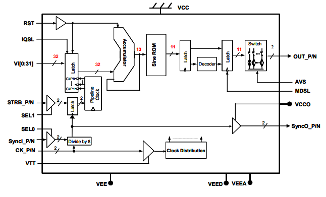 正(zheng)常保持(chi)模(mo)式的(de)(de)(de)DAC或(huo)高達第三(san)奈奎斯特帶(dai)約5.4 GHz的(de)(de)(de)返回到零(ling)模(mo)式的(de)(de)(de)DAC。初始階段可以(yi)重置為零(ling)度開始。該芯(xin)(xin)片有一(yi)對互補模(mo)擬輸(shu)出(chu)50Ω后(hou)端(duan)。輸(shu)出(chu)波(bo)形的(de)(de)(de)頻(pin)(pin)率(lv)(lv)可以(yi)由(you)三(san)十二個頻(pin)(pin)率(lv)(lv)控(kong)制位(wei)(wei)(wei)控(kong)制,VI[0:31]。DS878接(jie)受(shou)差(cha)分(fen)(fen)時鐘輸(shu)入(ru)(ru)(ru)或(huo)單端(duan)時鐘輸(shu)入(ru)(ru)(ru),并且(qie)具(ju)有具(ju)有用(yong)(yong)戶定義(yi)的(de)(de)(de)閾值的(de)(de)(de)50-片上后(hou)端(duan)子(zi)。頻(pin)(pin)率(lv)(lv)分(fen)(fen)辨(bian)率(lv)(lv)位(wei)(wei)(wei)接(jie)受(shou)LVTTL或(huo)CMOS輸(shu)入(ru)(ru)(ru)電(dian)(dian)平。差(cha)分(fen)(fen)同步(bu)輸(shu)入(ru)(ru)(ru)SyncI_P/N為多個芯(xin)(xin)片應(ying)用(yong)(yong)提供同步(bu),并且(qie)啟動(dong)(dong)每(mei)個芯(xin)(xin)片準(zhun)備接(jie)受(shou)頻(pin)(pin)率(lv)(lv)字輸(shu)入(ru)(ru)(ru)。同步(bu)選(xuan)(xuan)通輸(shu)入(ru)(ru)(ru)由(you)內部(bu)產生(sheng)的(de)(de)(de)8分(fen)(fen)頻(pin)(pin)時鐘的(de)(de)(de)過渡(du)邊鎖存,這些時鐘也被發(fa)送到輸(shu)出(chu)管腳SyncO_P/N。SyncO_P/N.可以(yi)用(yong)(yong)作參(can)考來同步(bu)頻(pin)(pin)率(lv)(lv)字和選(xuan)(xuan)通信號輸(shu)入(ru)(ru)(ru)定時與內部(bu)分(fen)(fen)頻(pin)(pin)8cl的(de)(de)(de)對準(zhun)。鎖正(zheng)確(que)。復位(wei)(wei)(wei)是異步(bu)的(de)(de)(de),以(yi)最小化(hua)模(mo)擬輸(shu)出(chu)的(de)(de)(de)時鐘延遲的(de)(de)(de)有效性。優化(hua)內部(bu)時序以(yi)避免頻(pin)(pin)率(lv)(lv)字過渡(du)或(huo)復位(wei)(wei)(wei)后(hou)的(de)(de)(de)時鐘滑動(dong)(dong)。只需要一(yi)個單一(yi)的(de)(de)(de)5V電(dian)(dian)源。