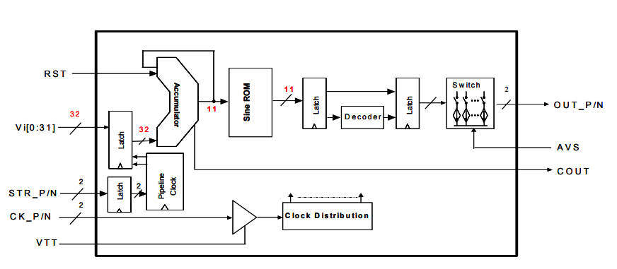 DS852是一種高速直接數字合成器(DDS),頻率調諧分辨率為32位,幅度分辨率為11位。第一奈奎斯特帶中的正弦波可以產生到接近1.1 GHz(在2.2-GHz時鐘速率)。初始階段可以重置為零度開始。該芯片有一對互補輸出50Ω后端。這個