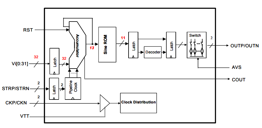 DS856是一種高速直接數字合成器(DDS),頻率調諧分辨率為32位,ROM相位分辨率為13位,DAC幅度分辨率為11位。第一奈奎斯特帶中的正弦波可以產生到接近1.6 GHz(在3.2-GHz時鐘速率)。初始階段可以重置為零度開始。該芯片有一對互補輸出50Ω后端。輸出波形的頻率可以由三十二個頻率控制位控制,VI[0:31]。DS856接受差分時鐘輸入或單端時鐘輸入,并且具有具有用戶定義的閾值的50_片上后端子。頻率分辨率位接受LVTTL或CMOS輸入電平。只需要一個5V的電源。
